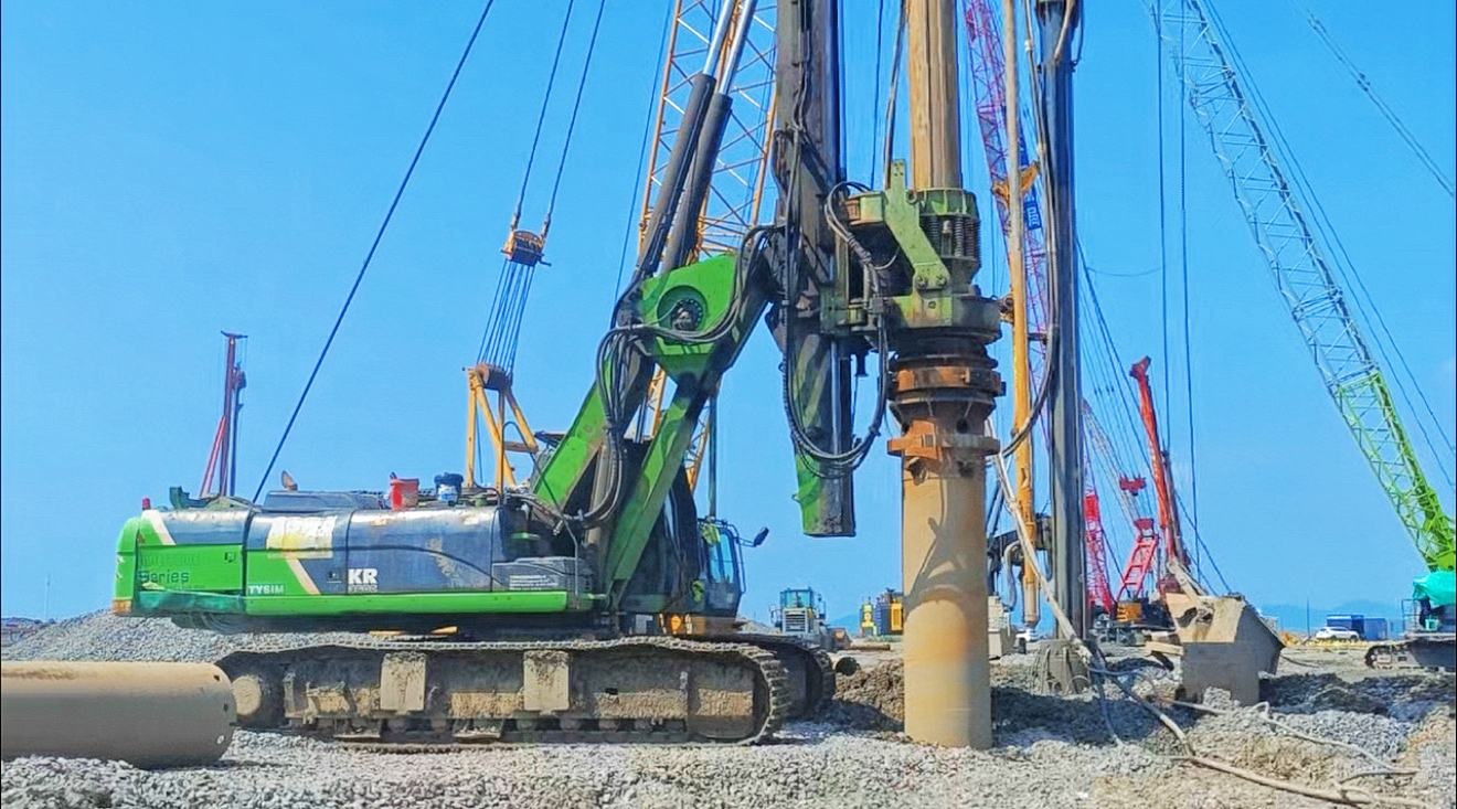 在這一超級工程中,泰信機械研制的卡特彼勒底盤旋挖鉆機KR360C展現(xiàn)出卓越性能。該設(shè)備與樁工陸英會伙伴北京振沖的振沖器協(xié)同作業(yè),針對填海石料層硬度高、緊密性強的特點,通過 0.8 米直徑引孔精準(zhǔn)穿透20~22米的回填層并下鋼護筒,隨后由振沖器實施碎石緊密加固。KR360C搭載的卡特彼勒全電控液壓系統(tǒng)可實現(xiàn)動力與負(fù)載智能匹配,在回填石料層鉆進施工過程中保持穩(wěn)定扭矩輸出,配合自主研發(fā)的 3 馬達動力頭與一鍵入巖模式,成孔效率較傳統(tǒng)設(shè)備提升30% 。