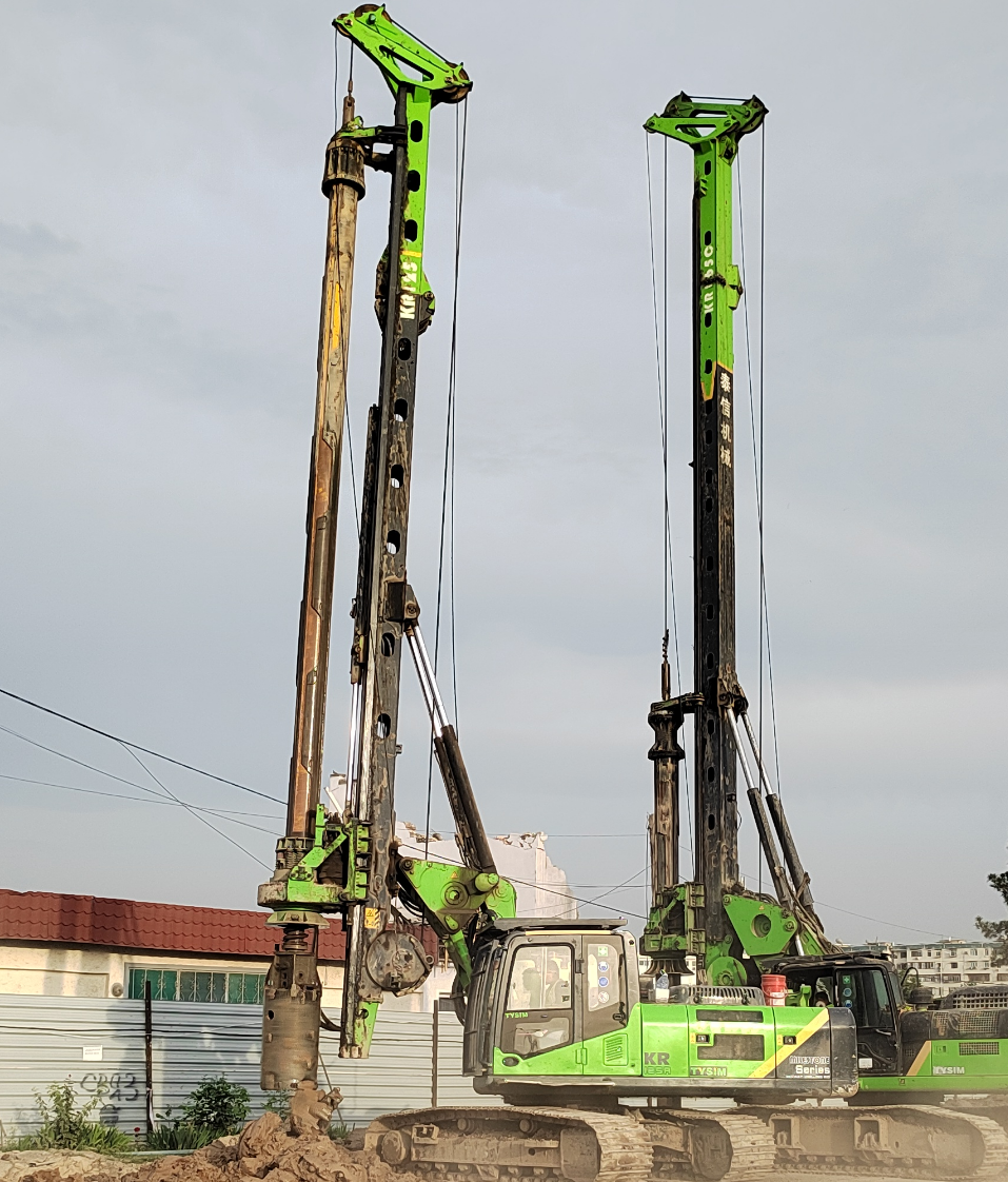 泰信機(jī)械研制的KR220、KR165、KR125三款旋挖鉆機(jī)展現(xiàn)出了卓越的性能。KR220 擁有強(qiáng)大的扭矩輸出和鉆進(jìn)動力,在7~17米的粘泥層施工中,能夠輕松克服粘稠土壤帶來的阻力,保證成孔效率和質(zhì)量;KR165則憑借其精準(zhǔn)的控制和穩(wěn)定的作業(yè)性能,在5~7米的粗砂層施工中,通過優(yōu)化泥漿配比和鉆進(jìn)參數(shù),有效避免了塌孔現(xiàn)象的發(fā)生,確保了施工的連續(xù)性;KR125則針對0~5米的復(fù)雜表層,快速破碎水泥硬化路面,處理沙卵石回填層和粉質(zhì)粘土層。?